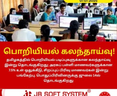 தமிழகத்தில் பொறியியல் படிப்புகளுக்கான கலந்தாய்வு இன்று தொடங்குகிறது. அரசுப் பள்ளி மாணவர்களுக்கான 7.5% உள் ஒதுக்கீடு, சிறப்புப் பிரிவு மாணவர்கள் இன்று பங்கேற்பு. பொதுப்பிரிவினருக்கு ஜுலை 14ல் தொடங்குகிறது.