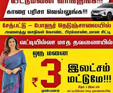 சேத்பட்டு – போளுர் நெடுஞ்சாலையில் அனைத்து வசதிகள் கொண்ட பிரம்மாண்டமான சிட்டி. வட்டியில்லா மாத தவணையில் ஒரு மனை ரூபாய்…