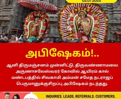 திருவண்ணாமலை அருள்மிகு அருணாசலேசுவரர் திருக்கோயிலில் ஆனி திருமஞ்சனம் (02.07.2025) இன்று காலை அருள்மிகு சிவகாம சுந்தரி உடனுறை அருள்மிகு நடராஜர் ஐந்தாம் பிரகாரத்தில்…