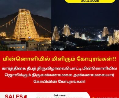 கார்த்திகை தீபத் திருவிழாவை முன்னிட்டு திருவண்ணாமலை அருள்மிகு அண்ணாமலையார் திருக்கோயிலின் கோபுரங்கள் மின்னொளி அலங்காரத்தில் மிளிருகின்றன. ஒளிவிளக்குகள் பதித்த நிலையில்,…