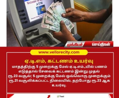 மாதத்திற்கு 5 முறைக்கு மேல் ஏ.டி.எம்.,யில் பணம் எடுத்தால் சேவைக் கட்டணம் இன்று முதல் ரூ.23 வசூல்; 5 முறைக்கு மேல் ஒவ்வொரு முறைக்கும் ரூ.21 வசூலிக்கப்பட்ட நிலையில்,…