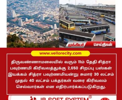திருவண்ணாமலையில் வரும் 11ம் தேதி சித்ரா பவுர்ணமி கிரிவலத்துக்கு 2,650 சிறப்பு பேருந்துகள் இயக்கம் சித்ரா பவுர்ணமியன்று சுமார் 30 லட்சம் முதல் 40 லட்சம் பக்தர்கள் வரை கிரிவலம்…