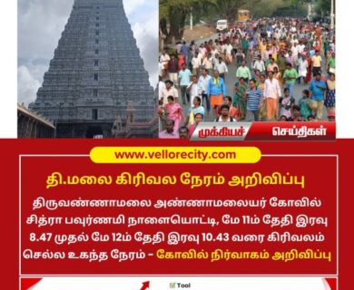 திருவண்ணாமலை அண்ணாமலையர் கோவில் சித்ரா பவுர்ணமி நாளையொட்டி, மே 11ம் தேதி இரவு 8.47 முதல் மே 12ம் தேதி இரவு 10.43 வரை கிரிவலம் செல்ல உகந்த…