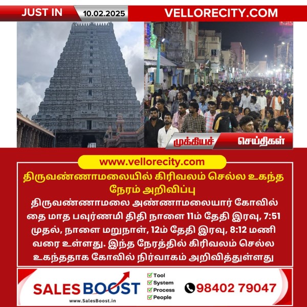 திருவண்ணாமலை அண்ணாமலையார் கோவில் தை மாத பவுர்ணமி திதி நாளை 11ம் தேதி இரவு 7:51 முதல், நாளை மறுநாள், 12ம் தேதி இரவு 8:12 மணி வரை உள்ளது. இந்த நேரத்தில் கிரிவலம் செல்ல உகந்ததாக கோவில் நிர்வாகம் அறிவித்துள்ளது.