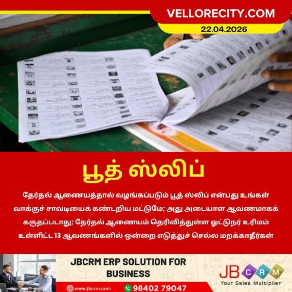 தேர்தல் ஆணையத்தால் வழங்கப்படும் பூத் ஸ்லிப் என்பது உங்கள் வாக்குச் சாவடியைக் கண்டறிய மட்டுமே; அது அடையாள ஆவணமாகக் கருதப்படாது தேர்தல் ஆணையம் தெரிவித்துள்ள ஓட்டுநர் உரிமம் உள்ளிட்ட 13 ஆவணங்களில் ஒன்றை எடுத்துச் செல்ல மறக்காதீர்கள்.