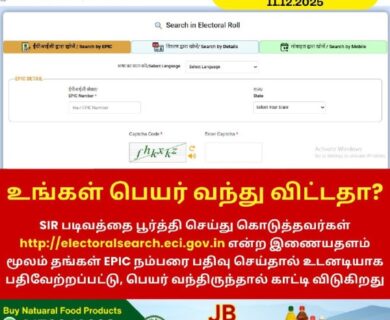 SIR படிவத்தை பூர்த்தி செய்து சமர்ப்பித்த வாக்காளர்கள், தங்களுடைய பெயர் வாக்காளர் பட்டியலில் சேர்க்கப்பட்டுள்ளதா என்பதை உடனடியாக சரிபார்க்கலாம். http://electoralsearch.eci.gov.in…