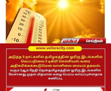 அடுத்த 5 நாட்களில் தமிழகத்தின் ஓரிரு இடங்களில் வெப்பநிலை 2 டிகிரி செல்சியஸ் வரை அதிகரிக்கக்கூடுமென வானிலை மையம் தகவல்.…