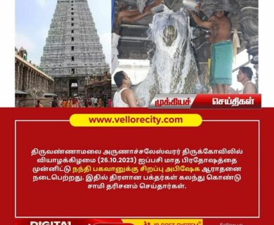 திருவண்ணாமலை அருணாச்சலேஸ்வரர் திருக்கோவிலில் வியாழக்கிழமை (26.10.2023) ஐப்பசி மாத பிரதோஷத்தை முன்னிட்டு நந்தி பகவானுக்கு சிறப்பு அபிஷேக ஆராதனை நடைபெற்றது.…