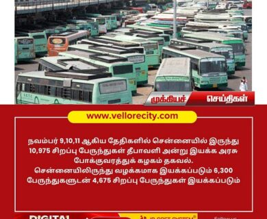 நவம்பர் 9,10,11 ஆகிய தேதிகளில் சென்னையில் இருந்து 10,975 சிறப்பு பேருந்துகள் தீபாவளி அன்று இயக்கப்படும். சென்னையிலிருந்து வழக்கமாக இயக்கப்படும்…