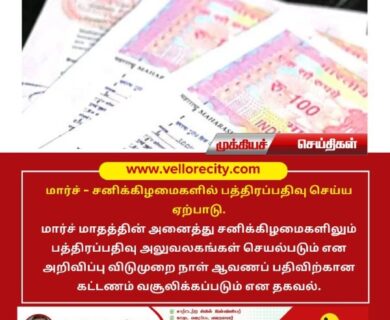 மார்ச் மாதத்தின் அனைத்து சனிக்கிழமைகளிலும் பத்திரப்பதிவு அலுவலகங்கள் செயல்படும் என அறிவிப்பு விடுமுறை நாள் ஆவணப் பதிவிற்கான கட்டணம் வசூலிக்கப்படும்…