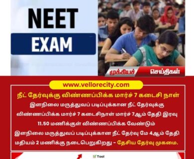 இளநிலை மருத்துவப் படிப்புக்கான நீட் தேர்வுக்கு விண்ணப்பிக்க மார்ச்7 கடைசிநாள் மார்ச் 7ஆம் தேதி இரவு 11.50 மணிக்குள் விண்ணப்பிக்க…