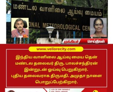 இந்திய வானிலை ஆய்வு மைய தென் மண்டல தலைவர் திரு. பாலச்சந்திரன் இன்றுடன் ஓய்வு பெறுகிறார். புதிய தலைவராக திருமதி. அமுதா நாளை பொறுப்பேற்கிறார்.