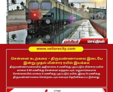 திருவண்ணாமலையில் அதிகாலை 4:00 மணிக்கு புறப்படும் மின்சார ரயில் காலை 9:50 மணிக்கு சென்னை வந்தடையும். மறுமார்க்கமாக சென்னையில் மாலை 6:00 மணிக்கு புறப்படும் ரயில், இரவு 12:00 மணிக்கு திருவண்ணாமலை…