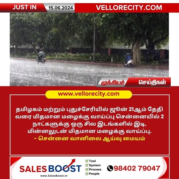 தமிழகம் மற்றும் புதுச்சேரியில் ஜூன் 21ஆம் தேதி வரை மிதமான மழைக்கு வாய்ப்பு சென்னையில் 2 நாட்களுக்கு ஒரு சில இடங்களில் இடி, மின்னலுடன் மிதமான மழைக்கு வாய்ப்பு. – சென்னை வானிலை ஆய்வு மையம்