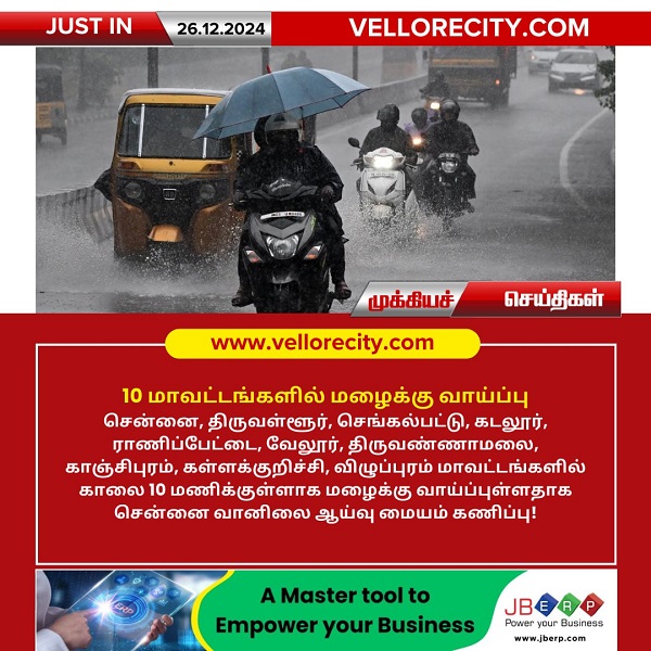 சென்னை, திருவள்ளூர், செங்கல்பட்டு, கடலூர், ராணிப்பேட்டை, வேலூர், திருவண்ணாமலை, காஞ்சிபுரம், கள்ளக்குறிச்சி, மற்றும் விழுப்புரம் ஆகிய 10 மாவட்டங்களில் இன்று (24.12.2024) காலை 10 மணிக்குள் மழைக்கு வாய்ப்புள்ளதாக சென்னை வானிலை ஆய்வு மையம் தகவல் தெரிவித்துள்ளது. மேகமூட்டம் மற்றும் மிதமான மழைக்கு வாய்ப்புள்ளது.