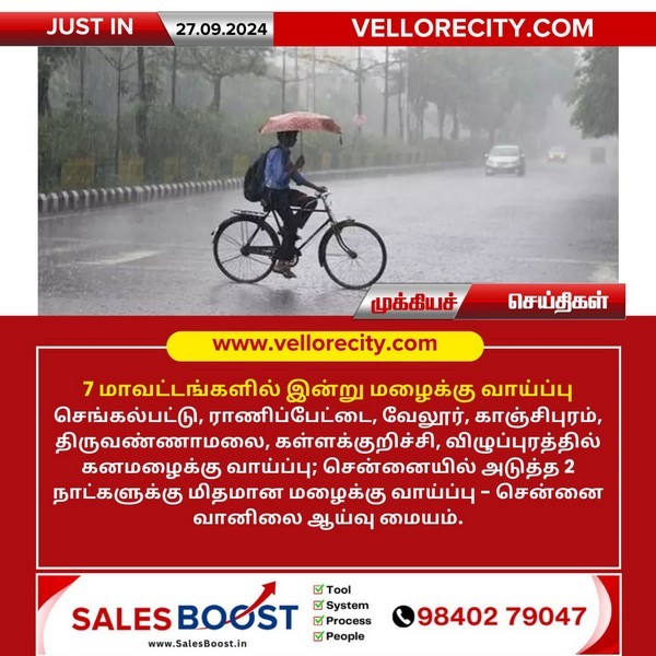 செங்கல்பட்டு, ராணிப்பேட்டை, வேலூர், காஞ்சிபுரம், திருவண்ணாமலை, கள்ளக்குறிச்சி, விழுப்புரத்தில் கனமழைக்கு வாய்ப்பு; சென்னையில் அடுத்த 2 நாட்களுக்கு மிதமான மழைக்கு வாய்ப்பு – சென்னை வானிலை ஆய்வு மையம்.
