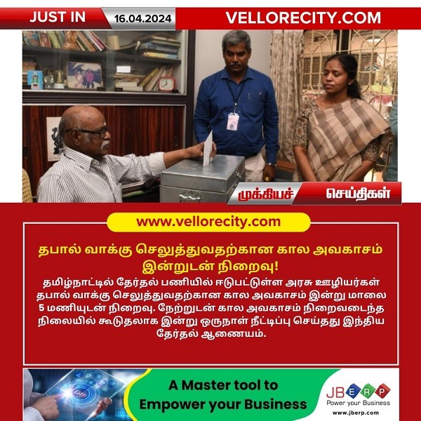 தமிழ்நாட்டில் தேர்தல் பணியில் ஈடுபட்டுள்ள அரசு ஊழியர்கள் தபால் வாக்கு செலுத்துவதற்கான கால அவகாசம் இன்று மாலை 5 மணியுடன் நிறைவு. நேற்றுடன் கால அவகாசம் நிறைவடைந்த நிலையில் கூடுதலாக இன்று ஒருநாள் நீட்டிப்பு செய்தது இந்திய தேர்தல் ஆணையம்.