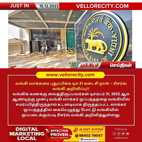 வங்கி லாக்கரை புதுப்பிக்க டிச.31 கடைசி நாள் – ரிசர்வ் வங்கி அறிவிப்பு!