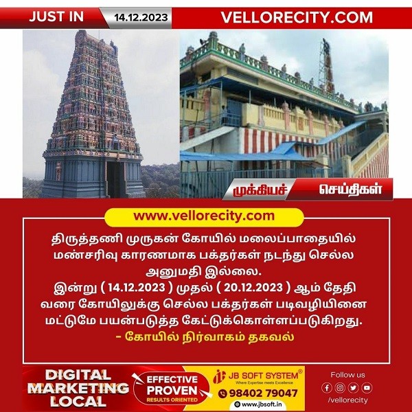 திருத்தணி முருகன் கோயில் மலைப்பாதையில் மண்சரிவு காரணமாக பக்தர்கள் நடந்து செல்ல அனுமதி இல்லை. 14.12.2023 தேதி முதல் 20.12.2023 தேதி வரை கோயிலுக்கு செல்ல பக்தர்கள் படிவழியினை மட்டுமே பயன்படுத்த வேண்டும் என கோயில் நிர்வாகம் தகவல் தெரிவித்துள்ளது.
