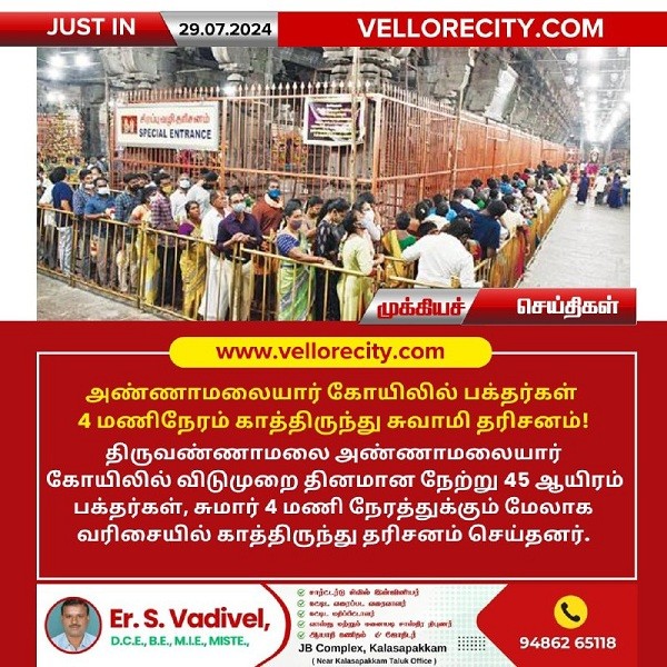 திருவண்ணாமலை அண்ணாமலையார் கோயிலில் விடுமுறை தினமான நேற்று 45 ஆயிரம் பக்தர்கள், சுமார் 4 மணி நேரத்துக்கும் மேலாக வரிசையில் காத்திருந்து தரிசனம் செய்தனர்.