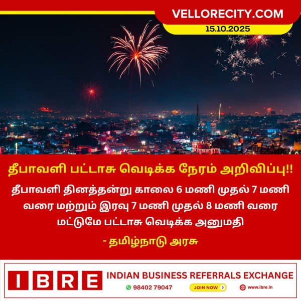 தீபாவளி தினத்தன்று காலை 6 மணி முதல் 7 மணி வரை மற்றும் இரவு 7 மணி முதல் 8 மணி வரை மட்டுமே பட்டாசு வெடிக்க அனுமதி என தமிழ்நாடு அரசு அறிவித்துள்ளது. 129