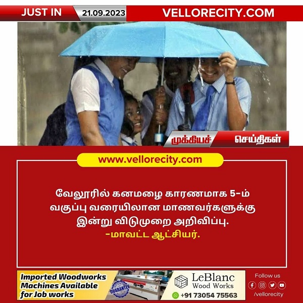 வேலூரில் கனமழை காரணமாக 5-ம் வகுப்பு வரையிலான பள்ளி மாணவர்களுக்கு மட்டும் இன்று (21.09.2023) விடுமுறை அறிவித்து மாவட்ட ஆட்சியர் உத்தரவிட்டுள்ளார்.