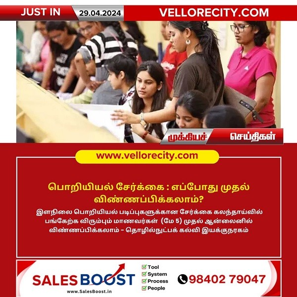 இளநிலை பொறியியல் படிப்புகளுக்கான சேர்க்கை கலந்தாய்வில் பங்கேற்க விரும்பும் மாணவர்கள் (மே 5) முதல் ஆன்லைனில் விண்ணப்பிக்கலாம் – தொழில்நுட்பக் கல்வி இயக்குநரகம். 501