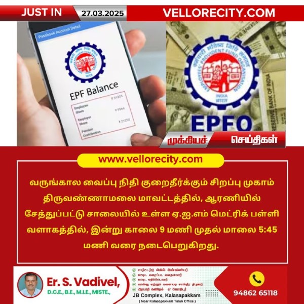 வருங்கால வைப்பு நிதி குறைதீர்க்கும் சிறப்பு முகாம் திருவண்ணாமலை மாவட்டத்தில், ஆரணியில் சேத்துப்பட்டு சாலையில் உள்ள ஏ.ஐ.எம் மெட்ரிக் பள்ளி வளாகத்தில், இன்று காலை 9 மணி முதல் மாலை 5:45 மணி வரை நடைபெறுகிறது.