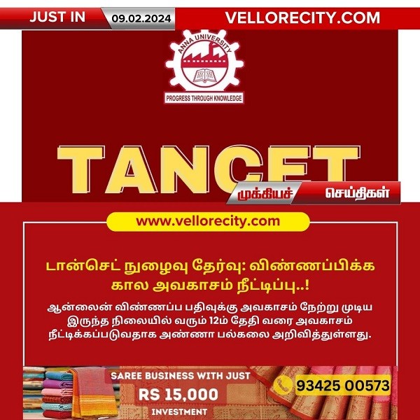 டான்செட் நுழைவு தேர்வுக்கான ஆன்லைன் விண்ணப்ப பதிவுக்கு அவகாசம் நேற்று (08.02.2024) முடிய இருந்த நிலையில் வரும் 12 – ஆம் தேதி வரை அவகாசம் நீட்டிக்கப்படுவதாக அண்ணா பல்கலை அறிவித்துள்ளது.