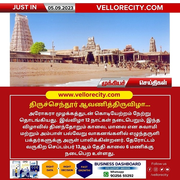 திருச்செந்தூர் ஆவணித் திருவிழாவிற்கான கொடியேற்றம் நேற்று (04.09.2023) அரோகரா முழக்கத்துடன் தொடங்கியது. இவ்விழா 12 நாட்கள் நடைபெறும், இந்த விழாவில் தினந்தோறும் காலை, மாலை என சுவாமி மற்றும் அம்பாள் பல்வேறு வாகனங்களில் எழுந்தருளி பக்தர்களுக்கு அருள் பாலிப்பார். மேலும், திருச்செந்தூர் ஆவணித்திருவிழா தேரோட்டம் வருகிற செப்டம்பர் 13 – ஆம் தேதி காலை 6 மணிக்கு நடைபெற உள்ளது.