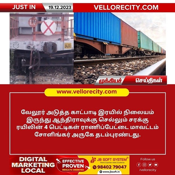 வேலூர் அடுத்த காட்பாடி இரயில் நிலையத்தில் இருந்து ஆந்திராவுக்கு செல்லும் சரக்கு ரயிலின் 4 பெட்டிகள் ராணிப்பேட்டை மாவட்டம் சோளிங்கர் அருகே தடம்புரண்டது. 885