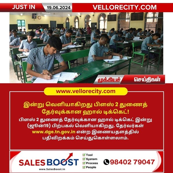 பிளஸ் 2 துணைத் தேர்வுக்கான ஹால் டிக்கெட் இன்று (ஜூன்19) பிற்பகல் வெளியாகிறது. தேர்வர்கள் www.dge.tn.gov.in என்ற இணையதளத்தில் பதிவிறக்கம் செய்துகொள்ளலாம்.