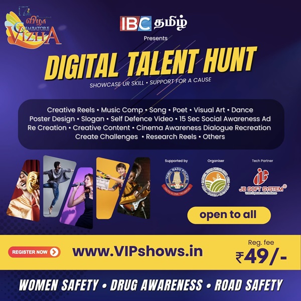 IBC Tamil, in partnership with the Tamil Nadu Police and the Department of Arts and Culture, is thrilled to announce the “Digital Talent Hunt” – a unique platform inviting individuals to showcase their talents while supporting crucial social causes. This event, with JB Soft System as the tech partner, aims to raise awareness on Women Safety, Drug Awareness, and Road Safety.