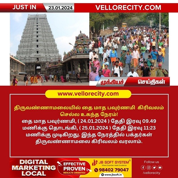 திருவண்ணாமலையில் தை மாதப் பெளா்ணமி கிரிவலம் புதன்கிழமை (ஜனவரி – 24) இரவு 09:49 மணிக்கு தொடங்கி வியாழக்கிழமை (ஜனவரி – 25) இரவு 11:23 மணிக்கு முடிகிறது. இந்த நேரத்தில் பக்தா்கள் கிரிவலம் வரலாம் என்று அருணாசலேஸ்வரா் கோயில் நிா்வாகம் அறிவித்துள்ளது.