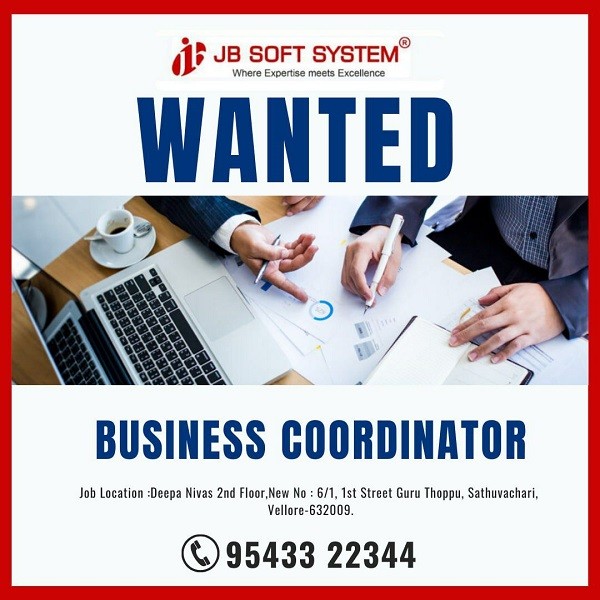 WANTED BUSINESS COORDINATOR Job Location :JB SOFT SYSTEM, Deepa Nivas 2nd Floor, New No: 6/1, 1st Street Guru Thoppu, Sathuvachari, Vellore-632009. 95433 22344