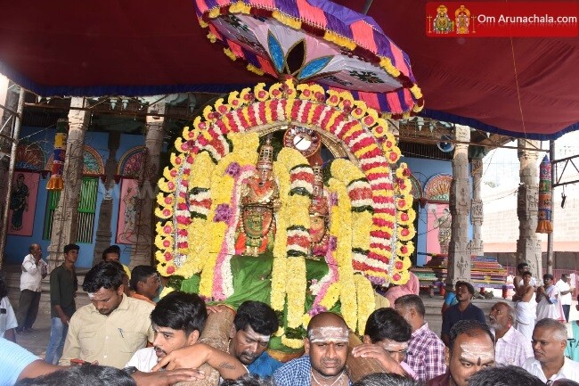 During the noon session of the 3rd Day of the Deepam Festival at Thiruvannamalai, the deities of Lord Chandrasekharar and Lord Vinayaka was taken on a procession around the street adjacent to the temple corridors. The event of Thiruvizha Undial (Festival Hundi) was performed at the 3rd corridor near the Kodimaram (flag-tree).