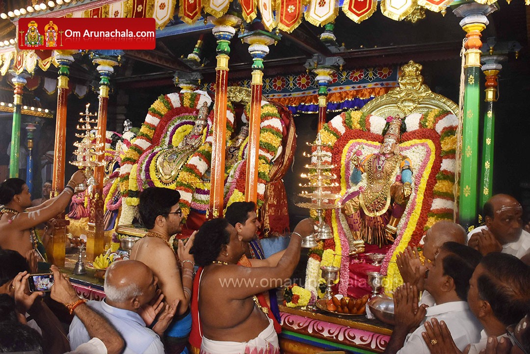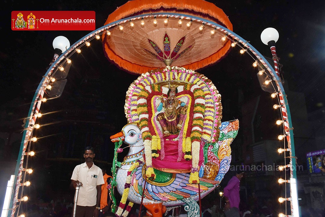 After the special Deeparadhanais, the deities were then taken on a procession from the Thirukkalayana Mandapam, along the Mada Veedhis with the deities of the Lord on the carriage of Simmam (lion) and His Consort Ambal on the carriage of annam (swan), and Lord Chandkeshwara on the carriage of Rishabam (bull).