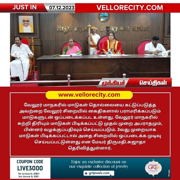 வேலூர் மாநகரில் சுற்றி திரியும் மாடுகளை வேலூர் சிறை கைதிகளால் பராமரிக்கப்படும் என மேயர் அறிவிப்பு!