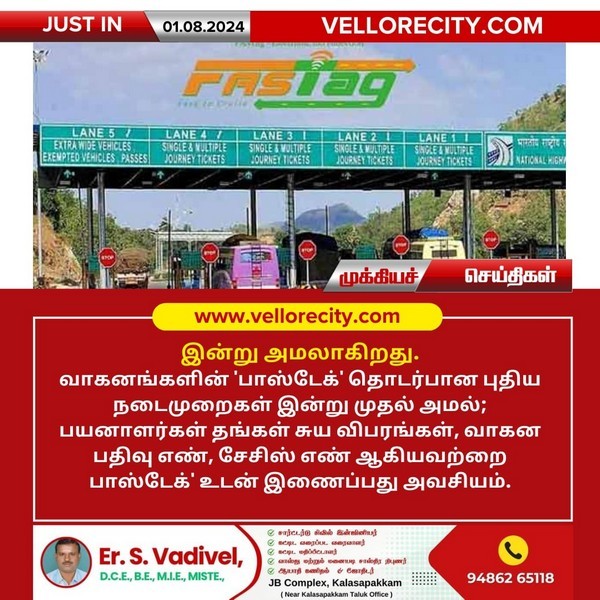 வாகனங்களின் ‘பாஸ்டேக்’ தொடர்பான புதிய நடைமுறைகள் இன்று முதல் அமல்; பயனாளர்கள் தங்கள் சுய விபரங்கள், வாகன பதிவு எண், சேசிஸ் எண் ஆகியவற்றை பாஸ்டேக்’ உடன் இணைப்பது அவசியம். 757
