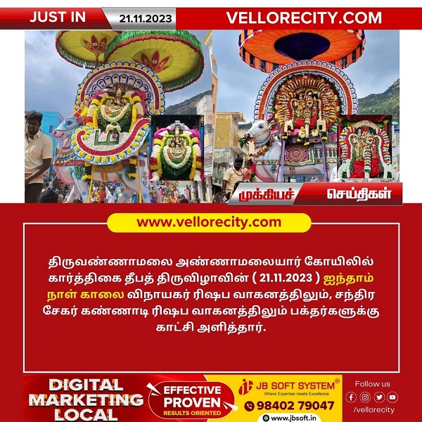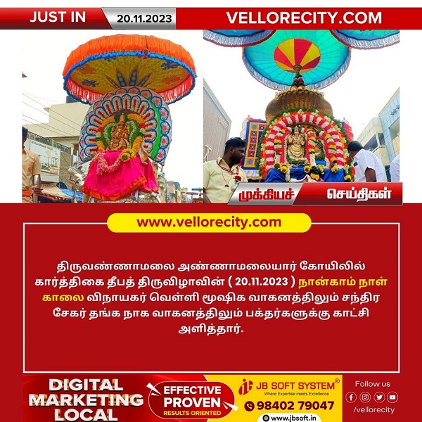 திருவண்ணாமலை அண்ணாமலையார் திருக்கோயிலில் திருக்கார்த்திகை தீபத் திருவிழா நான்காம் நாளான இன்று (27.11.2025) காலை விநாயகர் வெள்ளி மூஷிக வாகனத்திலும், சந்திரசேகரர் உண்ணாமுலை அம்மன் நாக...