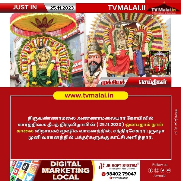 திருவண்ணாமலை அண்ணாமலையார் திருக்கோயிலில் திருக்கார்த்திகை தீபத் திருவிழா இரண்டாம் நாளான இன்று (25.11.2025) காலை அருள்மிகு சந்திரசேகரர் சூரிய பிரபை வாகனத்திலும் விநாயகர் மூஷிக வாகனத்திலும் மாட வீதி...