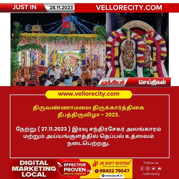 திருவண்ணாமலை அண்ணாமலையார் திருக்கோயிலில் திருக்கார்த்திகை தீபத்திருவிழா நான்காம் நாளான நேற்று (27.11.2025) இரவு பஞ்ச மூர்த்திகளான விநாயகர் வெள்ளி மூஷிக வாகனத்திலும், வள்ளி...