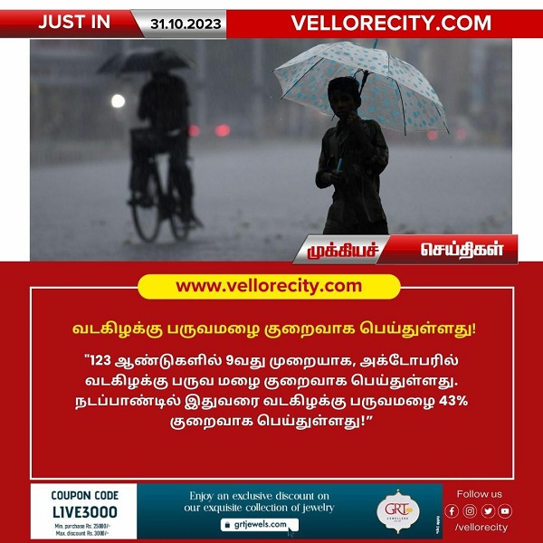 123 ஆண்டுகளில் 9வது முறையாக, அக்டோபரில் வடகிழக்கு பருவ மழை குறைவாக பெய்துள்ளது. நடப்பாண்டில் இதுவரை வடகிழக்கு பருவமழை 43% குறைவாக பெய்துள்ளது!