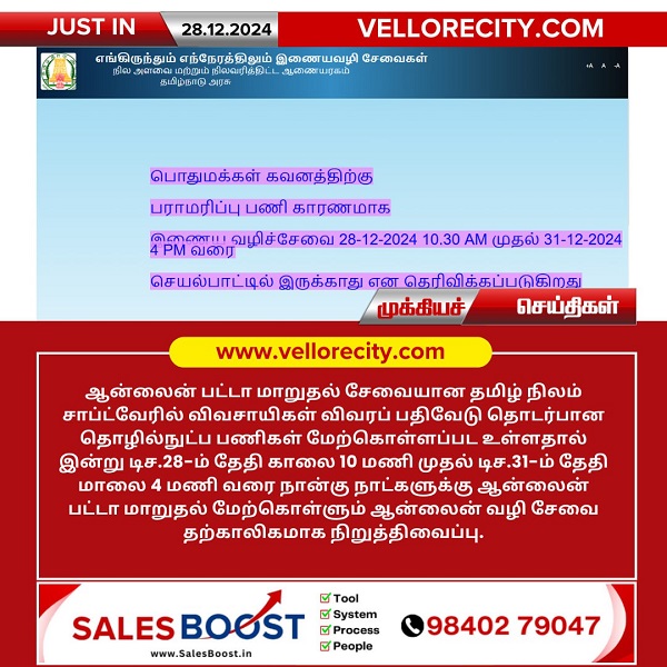 ஆன்லைன் பட்டா மாறுதல் சேவையான தமிழ் நிலம் சாப்ட்வேரில் விவசாயிகள் விவரப் பதிவேடு தொடர்பான தொழில்நுட்ப பணிகள் மேற்கொள்ளப்பட உள்ளதால் இன்று டிச.28-ம் தேதி காலை 10 மணி முதல் டிச.31-ம் தேதி மாலை 4 மணி வரை நான்கு நாட்களுக்கு ஆன்லைன் பட்டா மாறுதல் மேற்கொள்ளும் ஆன்லைன் வழி சேவை தற்காலிகமாக நிறுத்திவைப்பு.
