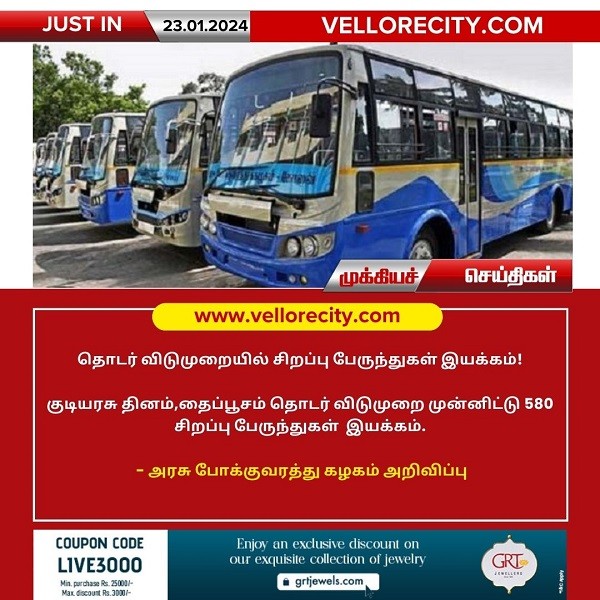 குடியரசு தினம்,தைப்பூசம் தொடர் விடுமுறை முன்னிட்டு 580 சிறப்பு பேருந்துகள் இயக்கப்படும் என அரசு போக்குவரத்து துறை தெரிவித்துள்ளது. 731