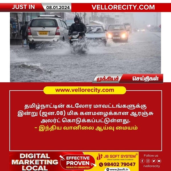 தமிழ்நாட்டின் கடலோர மாவட்டங்களுக்கு இன்று (ஜன.08) மிக கனமழைக்கான ஆரஞ்சு அலர்ட் கொடுக்கப்பட்டுள்ளதாக இந்திய வானிலை ஆய்வு மையம் தெரிவித்துள்ளது. 637