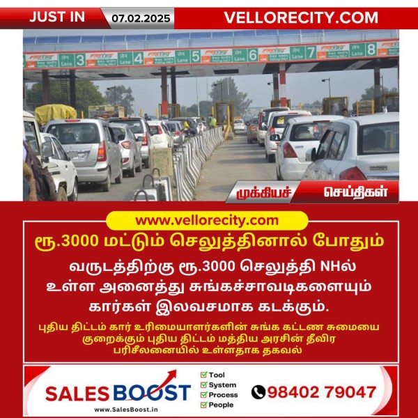 ரூ.3000 மட்டும் செலுத்தினால் போதும் வருடத்திற்கு ரூ.3000 செலுத்தி NHல் உள்ள அனைத்து சுங்கச்சாவடிகளையும் கார்கள் இலவசமாக கடக்கும். புதிய திட்டம் கார் உரிமையாளர்களின் சுங்க கட்டண சுமையை குறைக்கும் புதிய திட்டம் மத்திய அரசின் தீவிர பரிசீலனையில் உள்ளதாக தகவல் தெரிவித்துள்ளது.