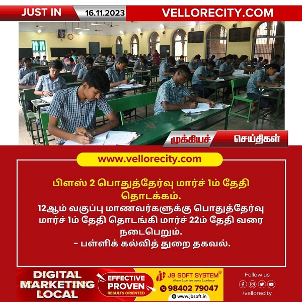 12ஆம் வகுப்பு மாணவர்களுக்கு பொதுத்தேர்வு மார்ச் 1-ம் தேதி தொடங்கி மார்ச் 22-ம் தேதி வரை நடைபெறும்.