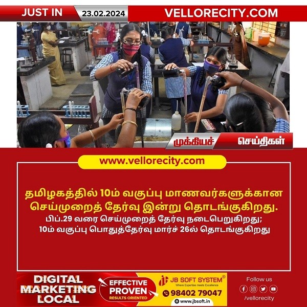 தமிழகத்தில் 10 – ஆம் வகுப்பு மாணவர்களுக்கான செய்முறைத் தேர்வு இன்று (23.02.2024) தொடங்கி பிப்ரவரி 29 – ஆம் தேதி வரை செய்முறைத் தேர்வு நடைபெறுகிறது. 10 – ஆம் வகுப்பு பொதுத்தேர்வு மார்ச் 26 ல் தொடங்குகிறது.