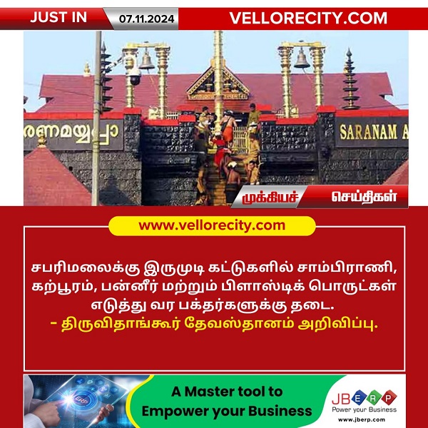 சபரிமலைக்கு இருமுடி கட்டுகளில் சாம்பிராணி, கற்பூரம், பன்னீர் மற்றும் பிளாஸ்டிக் பொருட்கள் எடுத்து செல்ல தடை!